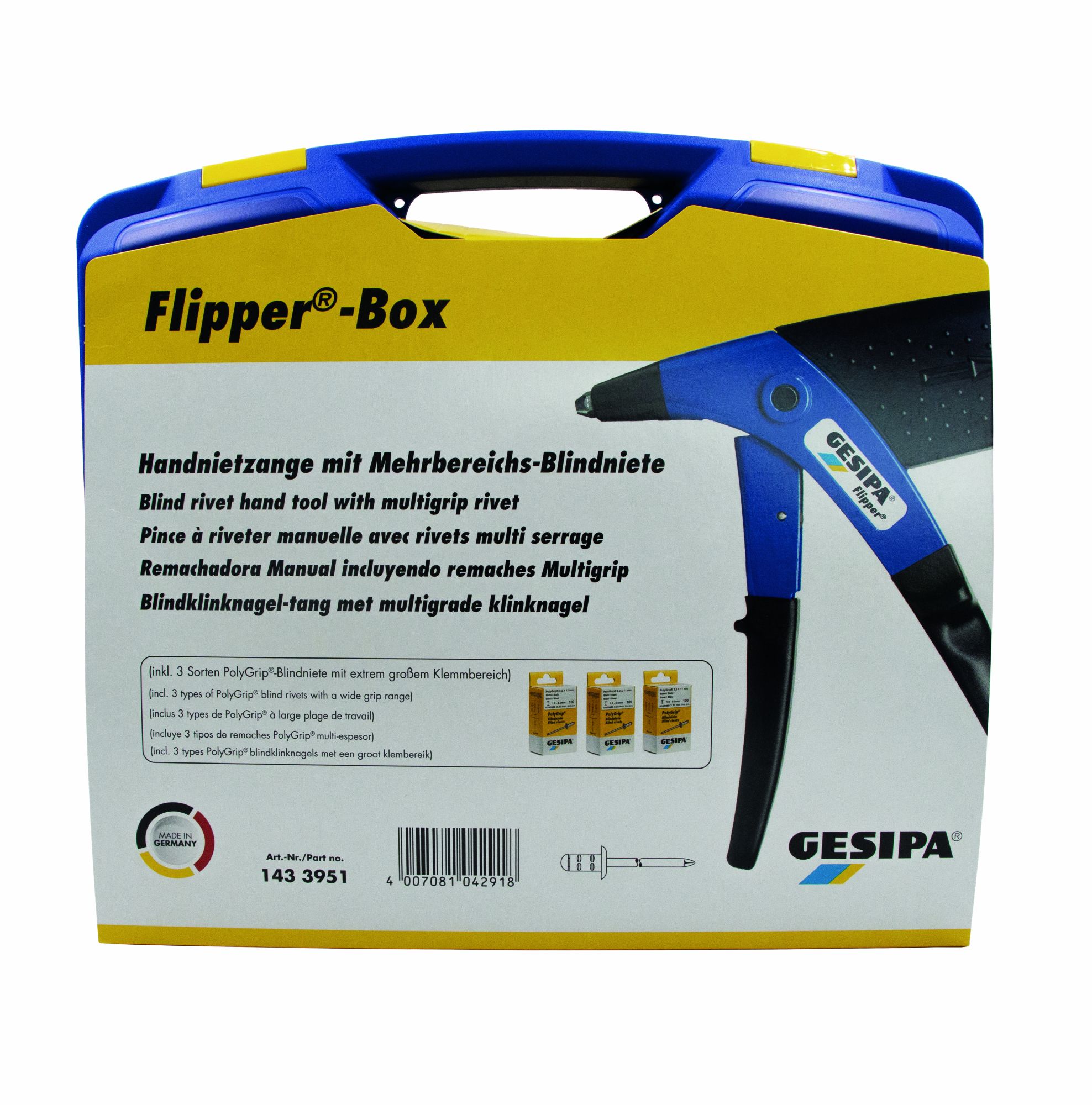 Flipper box Contents Blind rivet hand tool Flipper and 3 PolyGrip blind rivet sizes, in a lightweight plastic carrying case. Weight: approx. 0.9 kg Dimensions: 220 x 200 x 40 mm Incl. 3 blind rivet sizes PolyGrip Alu/steel 3.2 x 8.0 mm PolyGrip Alu/steel 4.0 x 10.0 mm PolyGrip Alu/steel 4.8 x 10.0 mm Flipper